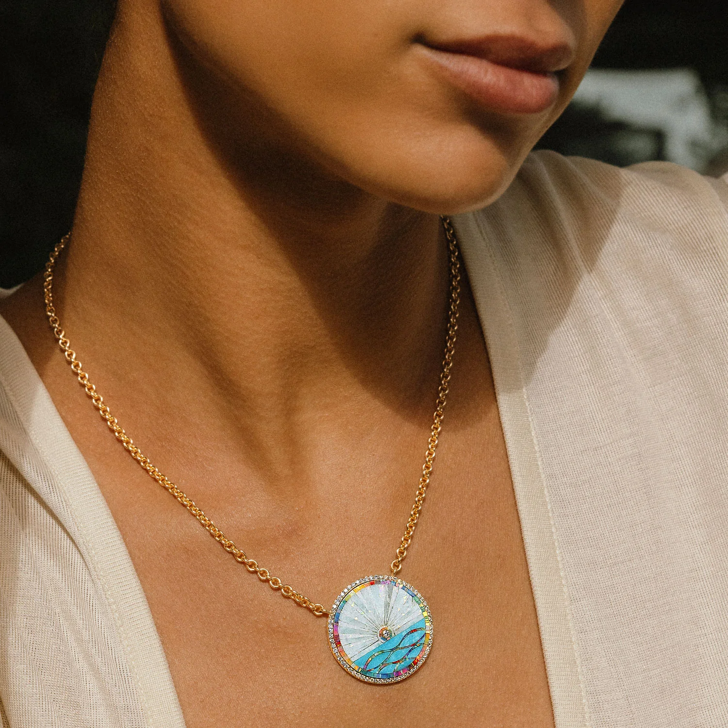 - Pendant measurements: 32mm with diamond bezel center