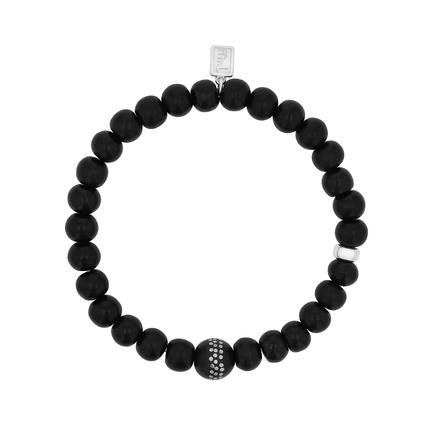 Men's black ebony 8mm bead bracelet with a special center bead that has hand hammered silver inlay.